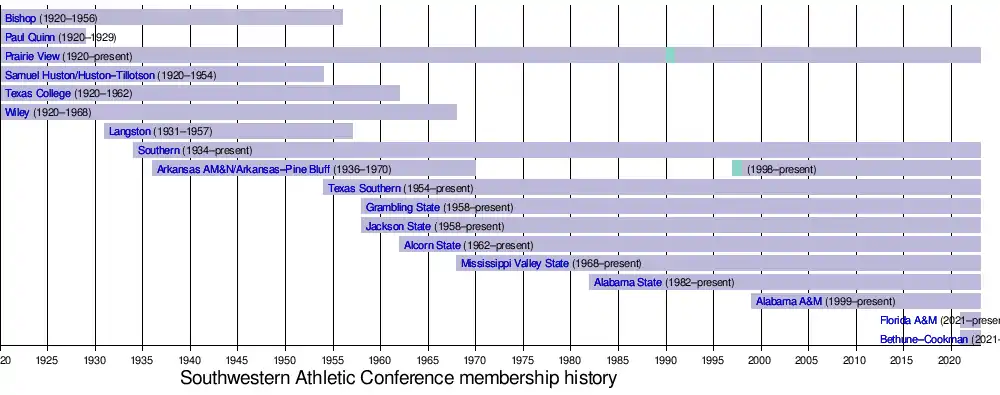 1. Arkansas–Pine Bluff left the SWAC after the 1969–70 school year as Arkansas AM&N; before re-joining in the 1997–98 school year as an affiliate, and to gain full member status the following season (1998–99).
