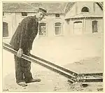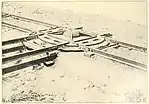 The Dolberg works in Rostock improved the Spalding system by using metal tie rods and by omitting the narrow wooden sleeper at one end of the panel. To secure the butt joint, the rails were hooked onto a metallic sleeper at one end. One rail was provided with a hooked tab which engaged around a metallic tie rod at the end of the other rails. Th joint could only be taken apart by lifting the opposite end of the frame (Figures 19 and 20).[3] The easy disassembly allowed other traffic to cross easily at level crossings by simply lifting one or two sections from the rail line.
