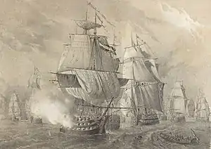 ![]() Príncipe de Asturias, flagship of Vice-Admiral Federico Gravina, during the Battle of Trafalgar. | |