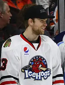 In the 2014–15 season, Abbott struggled with the Marlies, collecting 24 points in 46 games.[9] On February 26, 2015, Abbott was traded to the Chicago Blackhawks in exchange for defenceman T. J. Brennan.[10] He was reassigned to the Blackhawks' AHL affiliate, the Rockford IceHogs, where he remained for the duration of the season, recapturing his offence to produce 21 points in 19 games and a further 6 points in 8 playoff games.[11][12]