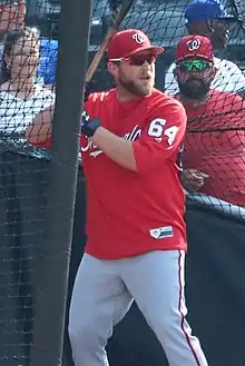 The Nationals invited Kieboom to major league spring training in 2018 as a non-roster invitee.[5][15] Despite not appearing in a regular-season professional game at any position other than catcher, Kieboom took the field more than once during 2018 spring training as a first baseman.[16] He began the season with Syracuse and appeared in 25 games with the Chiefs, batting .250, hitting a home run, and driving in 10 runs while appearing as both a catcher and occasional first baseman[5] before the Nationals called him up to the major leagues on May 11 after starting catcher Matt Wieters suffered an injury and went on the 10-day disabled list.[17] During the first game of a doubleheader against the Los Angeles Dodgers at Nationals Park in Washington, D.C., on May 19, Kieboom had his first career major-league start, and in the third inning he notched his first major-league hit, singling off of Dodgers starter Ross Stripling.[18] On September 11, 2018, Kieboom hit his first career home run while facing Philadelphia Phillies pitcher Nick Pivetta.[19]