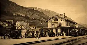 Technical progress also impacted transport links. On 1 July 1903 the Albula Railway opened between Thusis and Samedan, which connected the Engadin region with the cantonal capital, Chur. Hitherto hotel guests had been required to undergo a ten-hour journey, normally by post carriage, via the Julier or Albula Pass in order to reach Pontresina from Chur. That ten hour post carriage journey was now replaced with a four-hour railway journey. At Samedan Station trains were met by the Hotel Pontresina's own horse-drawn bus for the final 6 km (4 mile) climb up the valley to Pontresina.[17] It was exactly another five years before the branch line passing through Pontresina opened, on 1 July 1908, in the process linking the Albula railway to the Bernina railway and creating a through route to Tirano in Italy.