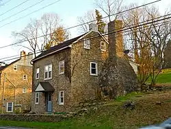 The residential buildings are predominantly two-and-one-half-story, stuccoed stone structures, some of which date to the mid-eighteenth century. Notable buildings include the Upper Mill or Spring Valley Mill (c. 1740), the Lower Mill (c. 1820), a blacksmith and wheelwright shop, a cooperage, a store, and two inns—the "Neff's Tavern" and Temperance Inn (c. 1838). The contributing structures are the Spring Valley Mill Dam and a stone arch bridge.[2]