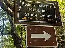 The Pollock-Krasner House and Studio on Springs-Fireplace Road is owned by Stony Brook University and is open for tours by appointment. It includes an external studio shed where dried paint from Pollock's projects is splattered on the floor and evokes Pollock's most famous works. The neighborhood around it is an East Hampton historic district. Springs-Fireplace Road gets its name from fireplaces at its terminus that was used to signal the residents of Gardiners Island that supplies were ready to be picked up.
