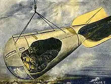 Captain Ernst A. Lehmann, the German airship captain, described in his book The Zeppelins how he and Baron Gemmingen, Count Zeppelin's nephew, had developed the device. To test the prototype he blindfolded the helmsman of the airship and allowed himself to be lowered by a winch from the bombroom in a modified cask, equipped with a telephone. Hanging some 150 metres (500 ft) below the airship using a compass he could tell the blindfolded helmsman which bearing to take and effectively drive the airship.[4] He later recounted how, while returning from the aborted raid on London in March 1916[5] in the Z 12, Baron Gemmingen insisted on being the first to use it on their secondary target, Calais. The basket was equipped with a wicker chair, chart table, electric lamp, compass, telephone,[5] and lightning conductor. With the Zeppelin sometimes within, sometimes above the clouds and unable to see the ground, Gemmingen in the hanging basket would relay orders on navigation and when and which bombs to drop. The Calais defenders could hear the engines but their searchlights and artillery fire did not reach the airship.[4]