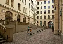 Touristic attractions are the statue of emperor Maximilian at the Universitätsstraße, the baroque stairway (with memorial badge at the former entrance to the Gewandhaus orchestra hall), Leipzig's oldest conserved elevator and the 'Straße der Stars', a walk of fame-like exhibition of hand imprints of prominent people (e. g. Mariah Carey, Max Schmeling, Hans Dietrich Genscher) in the courtyard.