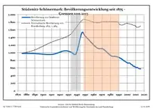 Development of population since 1875 within the current boundaries (Blue line: Population; Dotted line: Comparison to population development of Brandenburg state; Grey background: Time of Nazi rule; Red background: Time of communist rule)