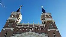 The twin-cross steeples at the entrance of St. Aloysius Church