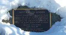 A plaque detailing the life of St. Aloysius is at the foot of his memorial near the church.