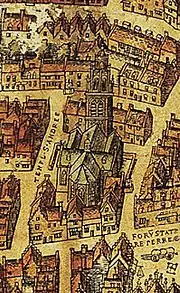Construction of the church commenced in the 16th century by Augustine friars who had built a convent with a chapel at the same location in 1513. Johannes van Mechelen of Osbach initiated 1508 the foundation of the monastery. The Augustinians decided to build a church there in 1514 but when they were accused of Lutheran sympathies the grounds were taken from them. In 1527 the site was parceled to finance the building of the church.[1] The former convent chapel was expanded and then consecrated as a parish church in 1529.[2] The church was later expanded with a tower in the west and a transept.[1]