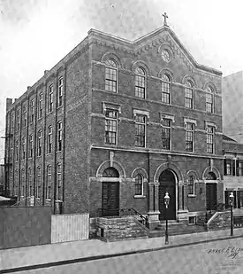 The first purpose-built church was a combination of church-and-school-and-convent structure, built 1904–1905, and dedicated by Cardinal Farley.[1] The three-story-over-basement brick Italianate structure housed the church on the first floor, church hall in the basement, and 5 classrooms on the second floor, with the third floor given over to additional classrooms and convent rooms.[1] The rectory address is 832 East 166 St., Bronx NY 10459.[8]
