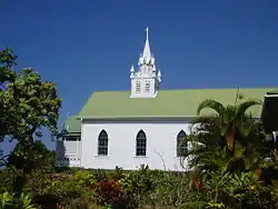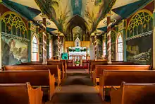 Saint Benedict's Catholic Church (also called simply The Painted Church[1]) is a parish of the Roman Catholic Church in Honaunau, Hawaii. It was built between 1899 and 1902 under the direction of the Belgian Catholic missionary Father John Velghe, who then painted frescoes along the interior ceiling and walls. An untrained folk-artist, Fr. Velghe depicted various biblical scenes, such as Cain's murder of Abel, Jesus refusing the Devil, and the writing on the wall, as well as a vivid illustration of sinners in Hell.[3] While the building itself is small and rectangular, Fr. Velghe painted Gothic vaults above the altar, creating the illusion of a European Gothic cathedral, inspired particularly by Burgos Cathedral.[1] Several other priests learned from Velghe and went on to establish other 'painted churches', including Star of the Sea Painted Church, painted by Father Evarist Gielen.[4]