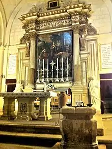The painting on the main altar is not of high artistic quality,[30] however it replaces another prestigious painting of the martyrdom of St. Catherine - now housed at the Żejtun Parish Museum - which is attributed to the Maltese painter Cassarino, in imitation of Caravaggio.[31] This latter painting returns striking similarities with the Beheading of Saint John the Baptist and other famous paintings by Caravaggio.[30] The titular painting rests in a stone framework, with a statue on each side. On the left, there is a statue of St. Catherine, while on the right one of St. Euphemia. These statues used to adorn the Cappella d'Italia at Saint John's Co-Cathedral, and were placed in Żejtun once they were replaced by marble statues.[30]