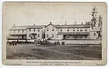 The first school was opened on the Yakima Indian Reservation in the state of Washington in 1860.[2] However, the first school to be federally funded was the Carlisle Indian Industrial School. Carlisle opened in November 1879 and had 147 students.[5] At this time, most Native Americans were living in poverty and couldn't afford to feed their children.[8] This is why some would say there was tremendous success with these schools and the number of students they had.[9]