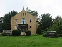 On a hilltop behind the St. Euphrosynia Belarusian Orthodox Church, a large memorial was installed bearing the official seal of the Byelorussian Central Council (Bielaruskaja Centralnaja Rada, or BCC) reads, "glory to those who fought for freedom and independence of Byelorussia." The stone memorial is topped by a large iron cross, with a small double-barred cross at its center, representing the Cross of Saint Euphrosyne and is a central element of the medieval Belarusian coat of arms, Pahonia.[3]