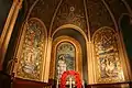 The interior of the nave is covered by a barrel-vaulted ceiling and is lit by five large stained glass windows on each side. The chancel dado is paneled and covered by a rib vaulted ceiling over the three-sided apse. The vaults are decorated by frescoes. The first and third panels of the apse are covered with mosaic panels, framing the central panel which contains a stained glass window.[7]