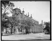 Rosecrans celebrated the first Mass in the unfinished cathedral on Christmas 1872. Soon after, Cardinal John McCloskey of New York donated marble, from the same quarry used in the construction of St. Patrick's Cathedral, New York, to construct a high altar and side altars.[1] In 1873, parish purchased the home of Joseph Gundersheimer, across Broad Street between Sixth and Seventh Streets, to house the clergy. It served until the diocese could construct a rectory attached to the cathedral.