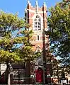 St. Luke's Episcopal Church is located northwest of the New Haven Green, at the corner of Whalley Avenue and Sperry Street in the city's Dixwell neighborhood. It is a single-story masonry structure, built out of red bricks with Indiana sandstone trim. It is L-shaped in plan, with the main sanctuary oriented with its long axis perpendicular to Whalley Avenue, covered by a gabled roof. The sides are buttressed, as is the tower that projects at the center of the front facade. A hyphen connects the sanctuary to a 20th-century addition fronting Sperry Avenue to the rear right side. The main entrance is at the center of the tower, set in a round-arch opening, above which is a small ornately surrounded stained glass window.[2]
