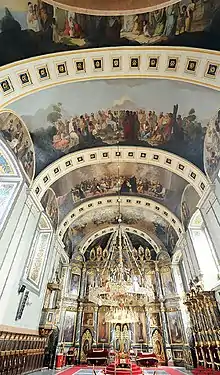 The cathedral was built between 1837 and 1840.[8] The gold-plated carved iconostasis was made by the sculptor Dimitrije Petrović, while the icons on the iconostasis, thrones, choirs and pulpits, as well as those on the walls and arches were painted by Dimitrije Avramović, one of the most distinguished Serbian painters of the 19th century.