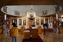 The interior decorations and fittings consist of the rich and much valued original collection of Russian religious art that had embellished the earlier cathedral. Two notable icons, both by Borovikovsky, are Our Lady of Sitka (familiarly the "Sitka Madonna") and Christ Pantocrator ("Christ the Judge" or "Christ Omnipotent").[11] The icon screens that divide the nave and the chapels from the altars are hung on the walls; a raised podium at the center of the nave is the bishop's throne, which has a backless cushioned seat, representing the Diocese, and an intricately embroidered carpet or "orlets" used by the bishop while offering divine services.[5] The iconostasis of the main sanctuary, dedicated to the Archangel (or St. Michael), has the deacon's doors and royal doors made in the Italian Roccoco design, contrasted to the simple exterior and interior walls. The screen of iconostasis, however, is new, carved out of wood and painted white with gilded border; it is an exact replica made from a small remnant of the original, retrieved from the fire.