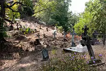 The cemetery consists of two parts. First is a small park-like ground, directly located to the left wing of the church. Only two tombs are located here, which are the grave of Rev. Fr. Anthony Paul Michael, containing the bones of the priest recovered in Tenom and the grave of Datuk Peter Mojuntin, a minister of Sabah, who died in the Double Six Crash tragedy.