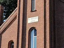 St. Monica's Roman Catholic Church was designed as a red brick Romanesque Revival style building with a tall central campanile and an Italian flavor.[5] The structure was given "an impression of height beyond its actual size" by slender pilasters outlining the brick.[5] Most of the building's modest decoration was made so by the delicate brick situated on the top of the side walls.[5] The inside of the church is a great open hall, which has been redecorated twice in a much higher style (during 1893 and the 1930s).[5] It was constructed with no interior columns for support; the interior was made spacious and could seat 500 people.[4] During the 1940s, Mario M. Cuomo was an altar boy for this church.[5]