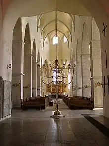 There is a four-metre high, seven-branched, brass candelabrum from 1519, one of the largest in Europe. On top of the middle branch stands a double-sided figure of the Virgin Mary with Child on a throne. It was a donation in 1519 by the wealthy Tallinn merchant Hans Bouwer.[11]