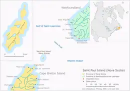 St. Paul Island (French: Île Saint-Paul) is a small uninhabited island located approximately 24 km (15 mi) northeast of Cape North on Cape Breton Island and 71 km (44 mi) southwest of Cape Ray on Newfoundland; it is along the boundary between the Gulf of St. Lawrence and the Cabot Strait.