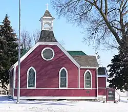 The church is a one-story frame structure with vertical tongue and groove siding below the window sills and horizontal clapboard siding above. The roof sections are gabled, all windows have pointed arches.[2]