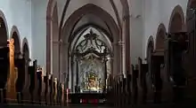 The Kollegiatsstift St. Peter und Alexander (also Stiftskirche Aschaffenburg or collegiate church Aschaffenburg or Basilica of SS. Peter and Alexander) is a Catholic church located in Aschaffenburg, Bavaria, Germany.[1][2][3][4] It is the town's oldest church, established in the 10th century, dedicated to Saint Peter and Saint Alexander. The main building was built as a Roman basilica, while other phases were built in the early Gothic style. The current structure is a cruciform basilica, reflecting a variety of styles including a Romanesque nave from the 12th century and a 15th-century tower.