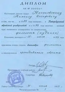 Leningrad Jewish University was established in 1989 as a continuation of the Baron Günzburg's Courses for Oriental Studies (1907-1917) and the Petrograd / Leningrad Jewish University (1919-1925). The latter was closed by the Soviet Authorities as "unnecessary" in 1925. The new Leningrad Jewish University was created in 1989 during the new Soviet policy of Perestroika by enthusiasts and Jewish Activists, Ilya Dvorkin (the first Rector of the university), Vaniamin Lukin, Khava Korzakova, and others. During its first year '89/90 only evening classes were offered of Hebrew, history, Torah studies, as well as seminars on Ethnography, Linguistics and Local History, and several others.[1]
