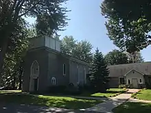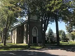 Built in 1858, the church is a stone Gothic Revival-style structure consisting of two gabled limestone sections: a one-story rectangular main block and an attached modern side wing. It features a three-stage tower with a limestone base, a wood midsection, and a domed cupola topped by a round finial and simple cross.[2]