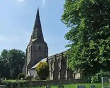 The church is built in sandstone. Its plan consists of a four bay nave which widens to the east, aisles to the north and south, a three bay chancel with north and south chapels, and a tower protruding from the southwest corner.[5] There is a contrast of styles between the chancel and the chapels, which are Perpendicular in style, and the nave, which is mainly Early Decorated.[4][6] Part of the south arcade survives from the Norman church and the north arcade is a copy of this.[7] The tower has deep buttresses, the western two of which are diagonal. On the northern side is a rectangular stair turret. On the west face is a window of two lights and at the second stage is a lancet window. The two-light bell openings are louvred. At the summit is a splay spire with lucarnes.[1] From masons' marks, the lower parts of the tower date from the very early 14th century while the "ringing loft" dates from the middle of that century. The door to the outside of the tower was blocked in the 18th century, when a new door was cut within the church, but was re-opened in 1847. The tower had been rebuilt in 1805 after being struck by lightning. The last work of any significance was carried out in 1905.[8]
