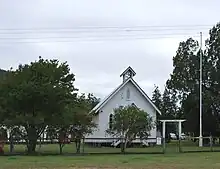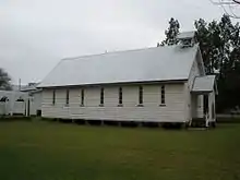 The former St Andrew's Presbyterian Church is a simple timber building located on the south bank of Sandy Creek and was built in 1876 on the first site of the new settlement at Esk. The former church site also contains a timber church hall and a manse.[1]