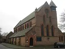 The foundation stone was laid on 24 October 1871 and the church was consecrated on 26 July 1872 by the Bishop of Lichfield.[3] It was 95 ft long, 26 feet wide and 50 ft to the apex of the roof. It was built of Spondon best red brick, with stonework only for the pillars of the arcades and tracery of the clerestory windows. The architect was F.W. Hunt of London and the contractor was Robert Bridgart of Derby. Mears and Stainbank of London provided a bell weighing nearly 6 cwt.
