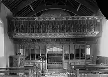 The Church of St Anno stands beside the River Ithon on the edge of the village of Llananno. Of medieval origin, it was entirely rebuilt in 1876–1877 by David Walker, a Liverpool-based architect.[2] Walker incorporated elements from the medieval church, including the 15th-century rood screen.[3] Cadw considers the screen as "the most richly decorated and one of the most complete in Wales".[4] Scourfield and Haslam, in their Powys volume of the Buildings of Wales describe the "glorious [screen as] among the best examples of screen-work in Wales”, and the best of the work of the Newton school of Welsh screen-carvers, and draw comparisons with similar screens at Newton itself, at Llanegryn, Gwynedd, and at Daresbury, Cheshire.[1] The screen was restored during the Walker restoration, and again in the 1960s.[4] It comprises ten arches, with a centrally-placed archway, which support a large gallery with two bressummers (beams) above and below a central parapet carved with 25 figures of "Christ, Patriarchs, Kings and Prophets". The figures are 19th-century replacements.[1] The bressummers themselves are carved with images of "fruit and foliage, the stems emerging from the mouths of serpents".[5]