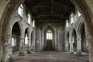 The four-bay arcades date from the early 13th century. The piers are octagonal, carried on tall octagonal plinths. The capitals of the north arcade are plain; three of the four capitals in the south arcade are carved with a variety of motifs. In the north wall of the chancel is an aumbry, and in the south wall are a piscina and a damaged sedilia. On each side of the east window is a large grotesque corbel painted white. In the chancel floor is the gravestone of a vicar of the church who died in 1413, and in the nave floor are two further gravestones with dates in the 18th century. The south aisle contains another grotesque corbel stone. The font dates from the early 13th century and consists of an octagonal bowl on an octagonal base. Also in the church are monuments dating from the 19th and early 20th centuries.[1]