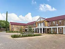 By the 1940s, the school's environs in the Germiston CBD were undergoing rapid industrialisation, concurrent with a general shift from north to south of much of Germiston's population, and in 1948 St Catherine's School relocated to the then newly developed suburb of Parkhill Gardens. Here there was also more space for sporting facilities.[2] The new school buildings were designed in a toned-down Romanesque Revival style, influenced by the late-nineteenth and early-twentieth century Arts and Crafts Movement, by the Irish Catholic architect Brendan Joseph Clinch, an associate of Herbert Baker.[3][4]
