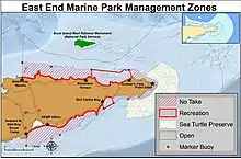 STXEEMP is managed with multiple-use zoning regulations in order to provide for a variety of legal uses. There are 4 zones: Recreational, No Take, Turtle Wildlife Preserve, and Open Fishing.[26][27] Only 8.6% of STXEEMP’s area is completely off-limits to fishing. The illustration to the right shows these zones and descriptions are below. A Storymap produced by the Park allows interactive exploration of the zones.