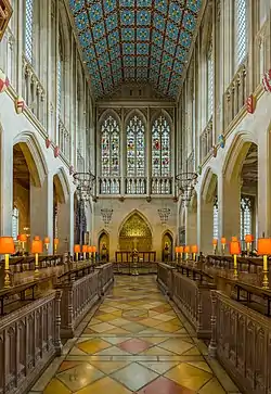 This church was largely rebuilt, starting in 1503, in the Perpendicular style by John Wastell, a master mason who also worked on King's College, Cambridge.[4] Further alterations to the building were undertaken in the 18th and 19th centuries, notably a new chancel and a hammerbeam roof by George Gilbert Scott.[5] When the Diocese of St Edmundsbury and Ipswich was created in 1914, St James's Church was made the cathedral. In 1959 Benjamin Britten wrote the Fanfare for St Edmundsbury for a "Pageant of Magna Carta" held in the cathedral grounds.[6]