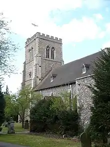 The church stands at the top of a hill with Old Hatfield village centre to the west. The building material is largely flint. It is cruciform with a tower at the western end. Most construction was between the 13th and 15th centuries.