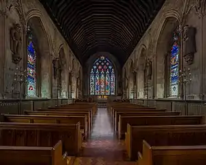 In 1952, new stained glass by Joseph Nuttgens was installed in the east window. It features the Trinity, the evangelists Matthew, Mark, Luke, and John, as well as the Virgin Mary and Saints Joseph, Bridget of Kildare and Etheldreda. The stained glass windows in the south wall depict scenes from the Old Testament, and the ones in the north wall show scenes from the New Testament.