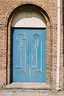 Decorated external door of Velarde’s own design at St Gabriel’s