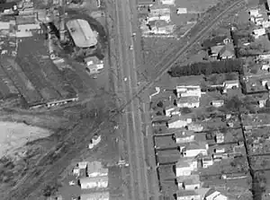 ![]() Aerial view of St George's Street railway station in 1968 (bottom-left), near the intersection between Saint George's Road and the Western Line | |