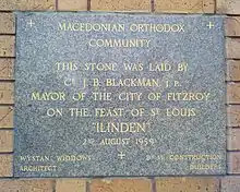 On 2 August 1959, Fitzroy mayor J. B. Blackman laid the church foundation stone which was blessed by Father George Haydar from the Syrian Orthodox Church in Melbourne.[9][5] On 2 August 1960, the church was officially opened after its consecration by the Bishop Naum of Zletovo-Strumica (Diocese of Macedonia), his deputy Father Nestor Popovski along with Father Ǵorǵi Angelovski.[9][2][13] A large number of Macedonians were present at the consecration ceremony till evening.[9] The gathered crowd expressed emotions of joy, especially as they were able to freely state being Macedonian.[14] The first priest of St George was Father Ǵorǵi Angelovski.[9] Annually during Easter celebrations, the Macedonian community would circle the church three times.[15]