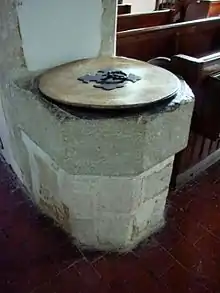 The font within the church is from the Norman era, possibly even Saxon.[13] The pulpit was described by the Sittingbourne, Milton, and District Directory 1908/09 as Tudor period but other authorities have described it as Jacobean.[2][13] It is hexagonal with a sounding board behind. The front panels and sounding board carry incised decoration.