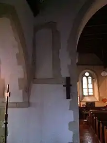 A church existed before the Norman conquest. In 1086 the lack of change in value pre-conquest (TRE[lower-alpha 1]) to 1086 (as now) may suggest that no major building work had occurred in the intervening 20 years. In the south wall of the nave by the porch is what looks like an Anglo-Saxon double-splayed window.[5] The window had been covered up and was revealed in 1879. Tatton-Brown (1993) states that it is not possible to be certain that it is an Anglo-Saxon window, but it is possible it could be early Norman. The official listing record describes the church as "First half C11, C13 and C15, restored 1879–80 by Clarke" which agrees with Tatton-Brown's earlier date.[3]