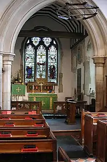 Within the church is a plaque honouring the men of the village who died in the First World War, which is listed by the Church of England as a Grade II.[8] The altar rail is dedicated to those of the church's youth fellowship who died during the Second World War. Their names are remembered on a nearby plaque.[9] A further memorial to members of the fellowship killed in the war is the Book of Remembrance.[10] The Middlesex Regiment and Home Guard is commemorated by two stained glass windows in the south aisle of the church.[11]