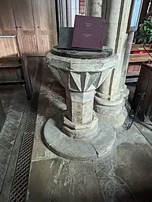 The font is of similar date to the church. There is a worn tablet in the south aisle commemorating Robert and Anne Lovell, who both died in 1421.[1] Other memorials are to Tomlinson Bunting, who died in 1768, and to Joseph and Sarah Hotham, erected in 1791.[3] The register starts in 1538.[5]