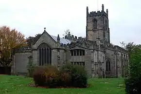 St Helen's Church has a maximum length of 41.70 metres (136.8 ft)[14] and is aligned at 25° north of east.[15] The majority of English churches have an alignment within a few degrees of east, so this is an exceptionally large deviation from the norm.[16][17] The sandstone church has a large, mainly 15th-century west tower supported by corner buttresses and topped with battlements and pinnacles. The tower has a four-light window and west doorway, and contains a spiral stairway to the bell and clock chambers and the roof. The chancel is adjoined by the former north chapel (now the vestry) on one side and the Hastings Chapel, set transept-wise on the other;[4] it has three sedilia and a piscina on its northern wall.[14] The nave is significantly wider than it is long,[4] and has four bays with medieval inner north and south aisles and 19th-century outer aisles. The Hastings Chapel, chancel and clerestory are embattled, and the former north chapel is English Perpendicular, with a window of the same style.[14][18] The piers in the nave were remodelled in the 15th century, and have incised panels, as do some of the arches. This feature is of an unusual style and is also seen at Sherborne Abbey in Dorset and at St Peter and St Paul, Syston, Leicestershire.[14][18]